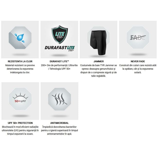 Fabricat din materialul Durafast Lite® (≈ 88% poliester / 12% spandex), jammerul este proiectat pentru a rezista la peste 200 de ore de utilizare intensă, fără să își piardă forma sau culoarea.