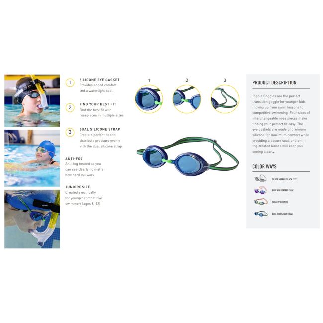 FINIS Ripple Goggles sunt ideali atât pentru piscine interioare, cât și pentru cele exterioare, datorită confortului și stabilității oferite. Sunt potriviți pentru lecții, antrenamente sau momente de joacă în apă.